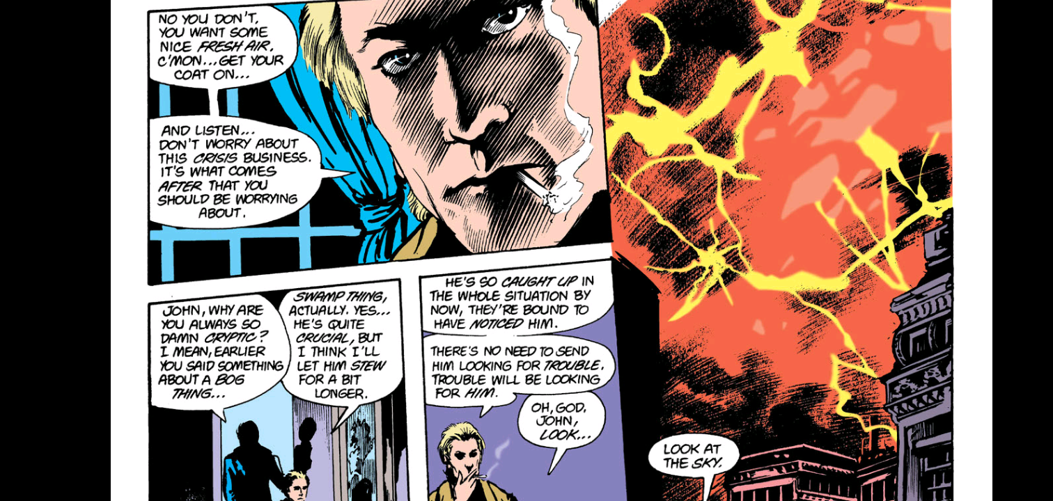 Throughout all of this, Constantine is dealing with some sort of Crisis on Infinite Earths. As the story involves the death and rebirth of the multiverse, naturally, every ongoing comic at the time got dragged into it, including Swamp Thing. In a bit of leaning on the fourth wall by Moore, Swamp Thing questions what this has to do with his personal quest and what he has to do with this crisis when he has no idea who anyone there is; even in the earliest days of big events in comics, there was a sense of annoyance about them interrupting story arcs.