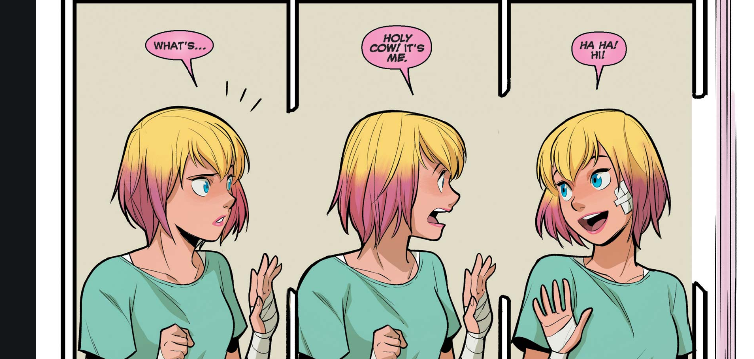 Kate assumes that Ghost Rider kidnapped Gwen, Cecil gets sucked into a mystical diamond that dwarves were going to use for a ritual, and the dwarves get away while Robbie takes the diamond to keep it out the hands of any wrongdoers, unaware that Cecil's inside it. For her part, Kate takes Gwenpool's fourth wall awareness better than most.