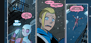 At this point, Gwenpool's medium awareness goes full throttle, and she slips into the space between panels. The next issue, we get a look into what happened when Teddy got into the Marvel universe; the version of his parents that he found had no idea who he was, and with no ID, his job options were limited. He saw his sister in action during her first issue... and he was horrified.